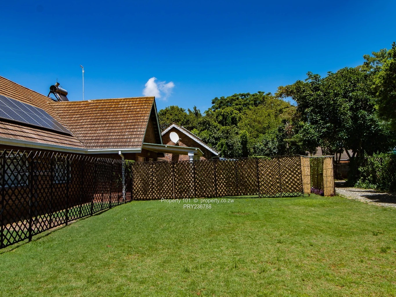 The complex is securely walled with razor wire and an electric gate, with irrigated gardens throughout. Water supply includes a seasonal borehole and reliable municipal water.